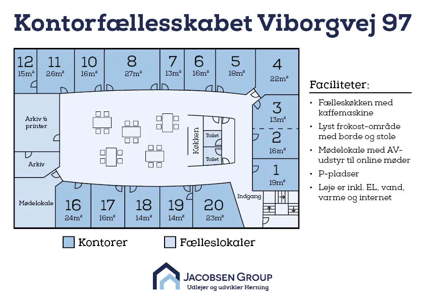 Kontorfællesskabet på Viborgvej besår af 16 kontorlokaler i forskellige størrelser. Her er mulighed for mange forskellige typer af små virksomheder i de moderne og lyse kontorer.
