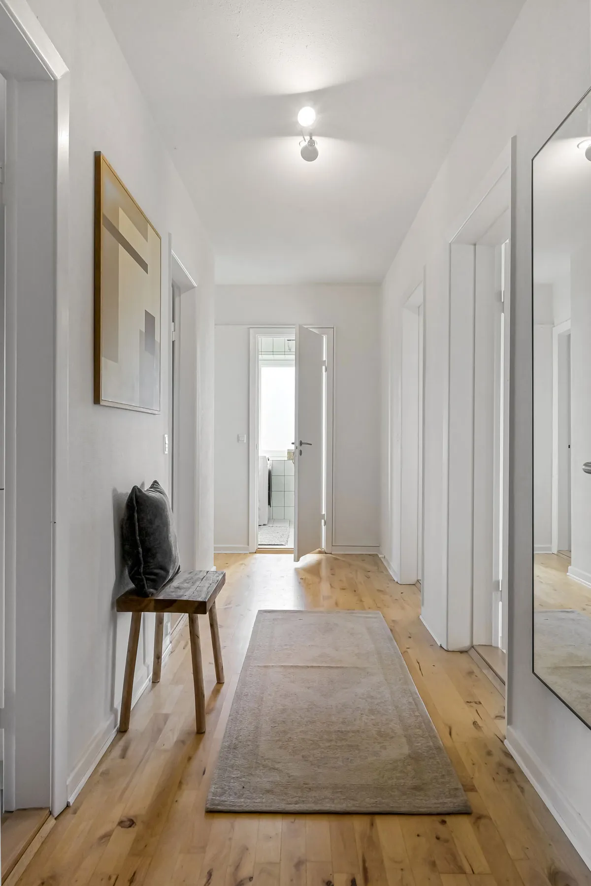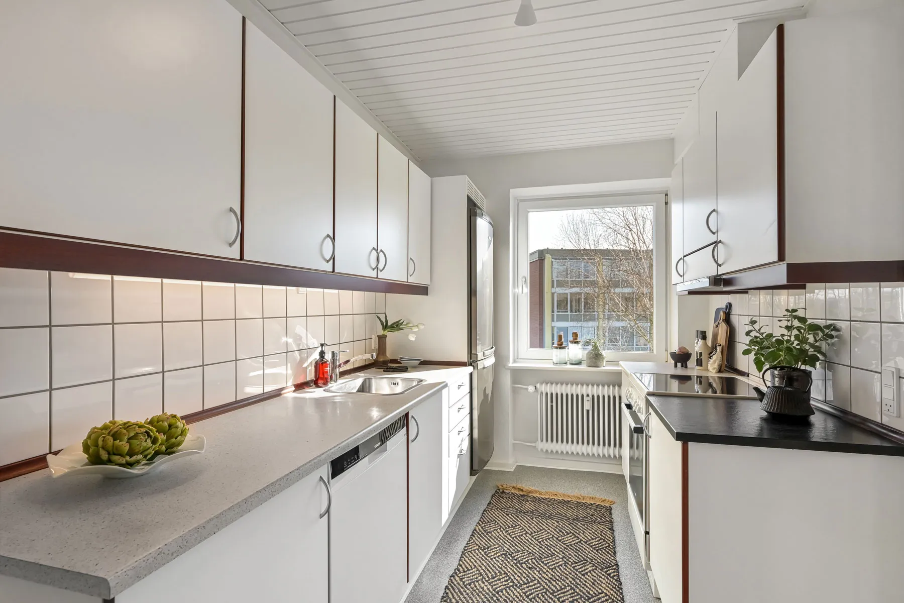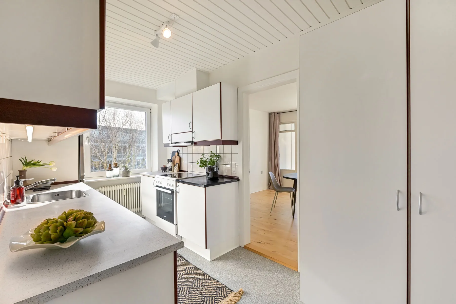 Lejligheden har to gode værelser med indbyggede skabe, et rummeligt soveværelse med skabsvæg, en stor spisestue og en lys stue – begge med udgang til den store lukkede altan. Derudover er der et badeværelse med brus samt et køkken med alle hårde hvidevarer, herunder også opvaskemaskine og vaske-tørremaskine.