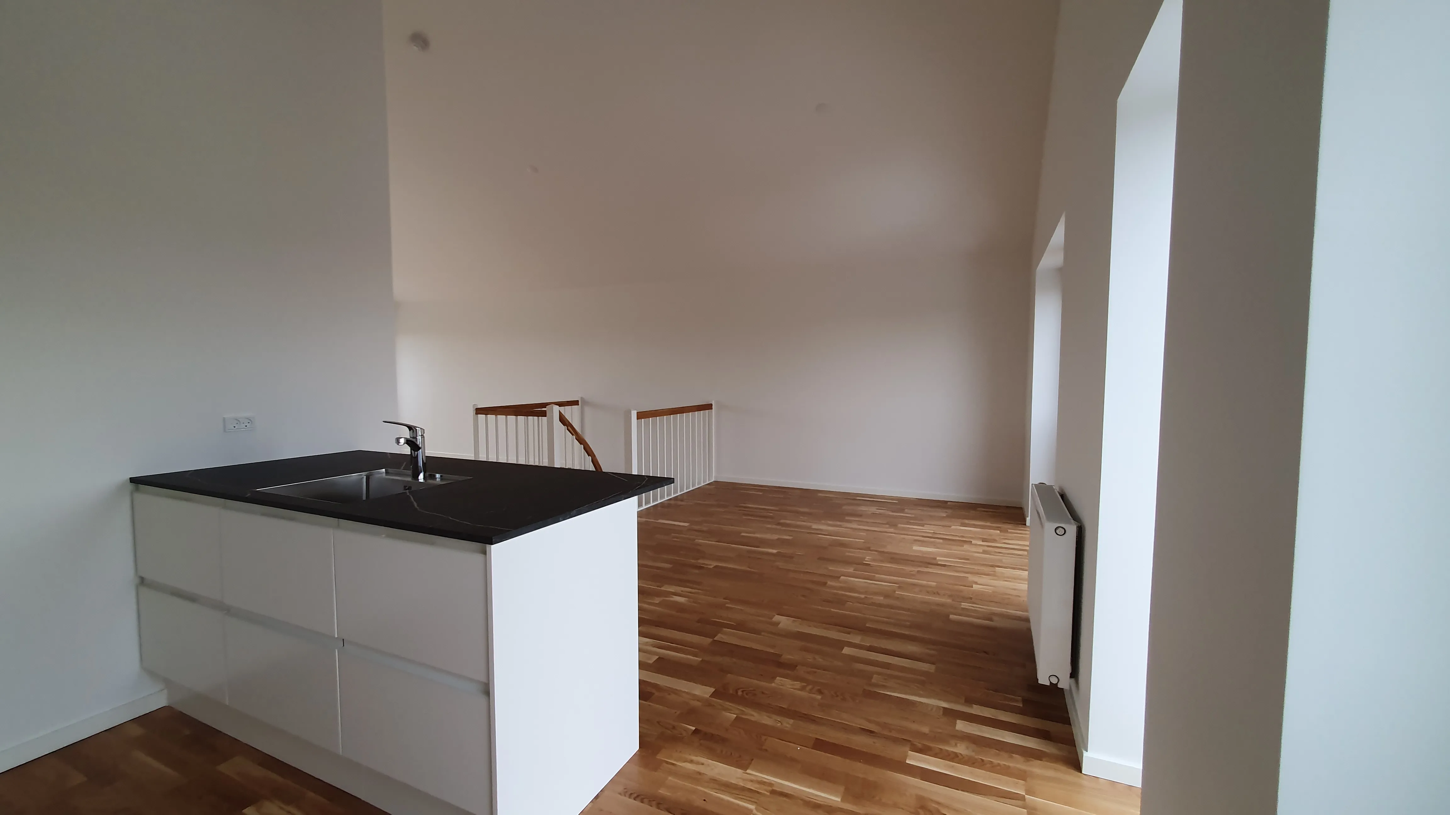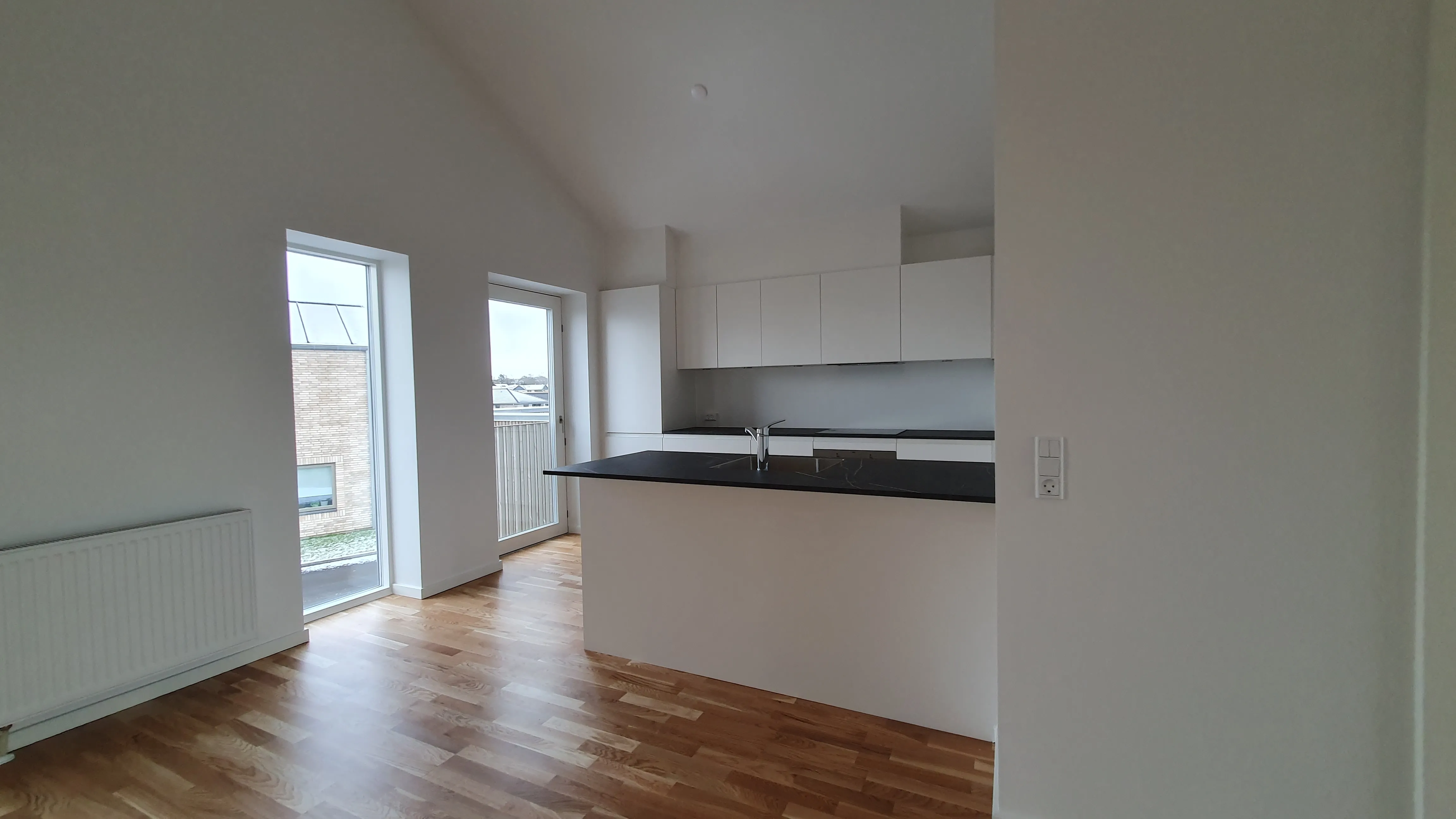 På første sal vil du blive mødt af et lyst og luftigt køkken-alrum og en indbydende stue. Her er det sidste værelse samt endnu et moderne badeværelse med brus. Fra alrummet er der adgang til den skønne altan, hvorfra du kan nyde udsigten ud over Fuglsangsø. Alle værelser er udstyret med indbyggede skabe, og gulvene er smukke lyse trægulve med flotte klinker i badeværelserne.